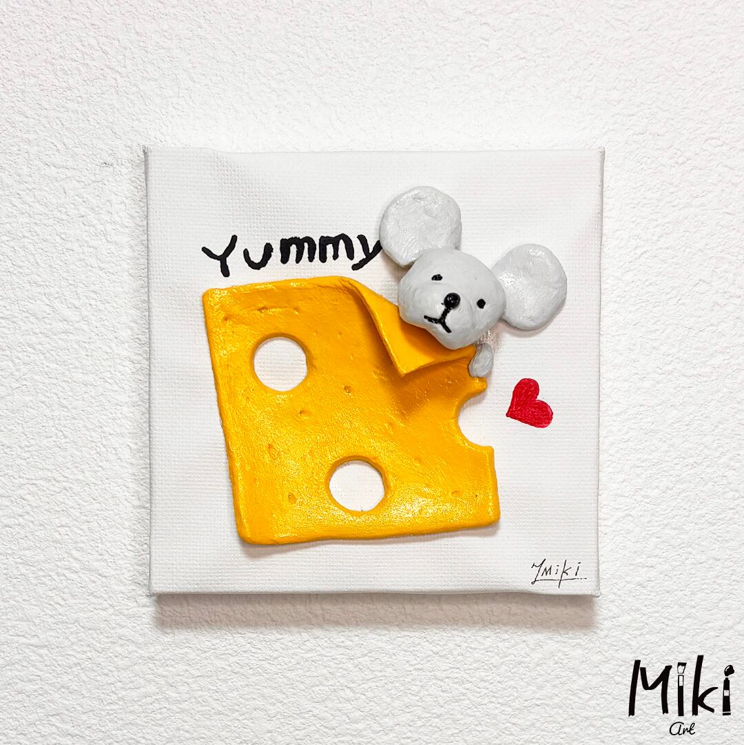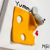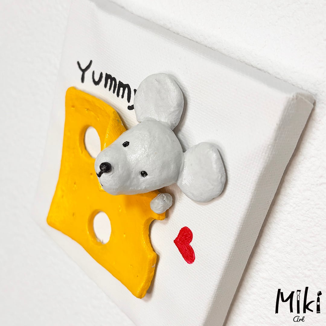 小さなキャンバスに粘土でチーズとねずみをアートしました。