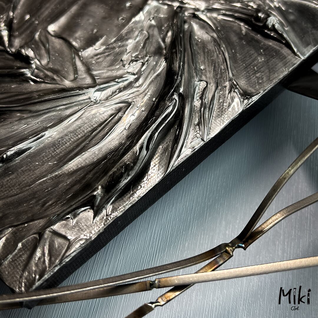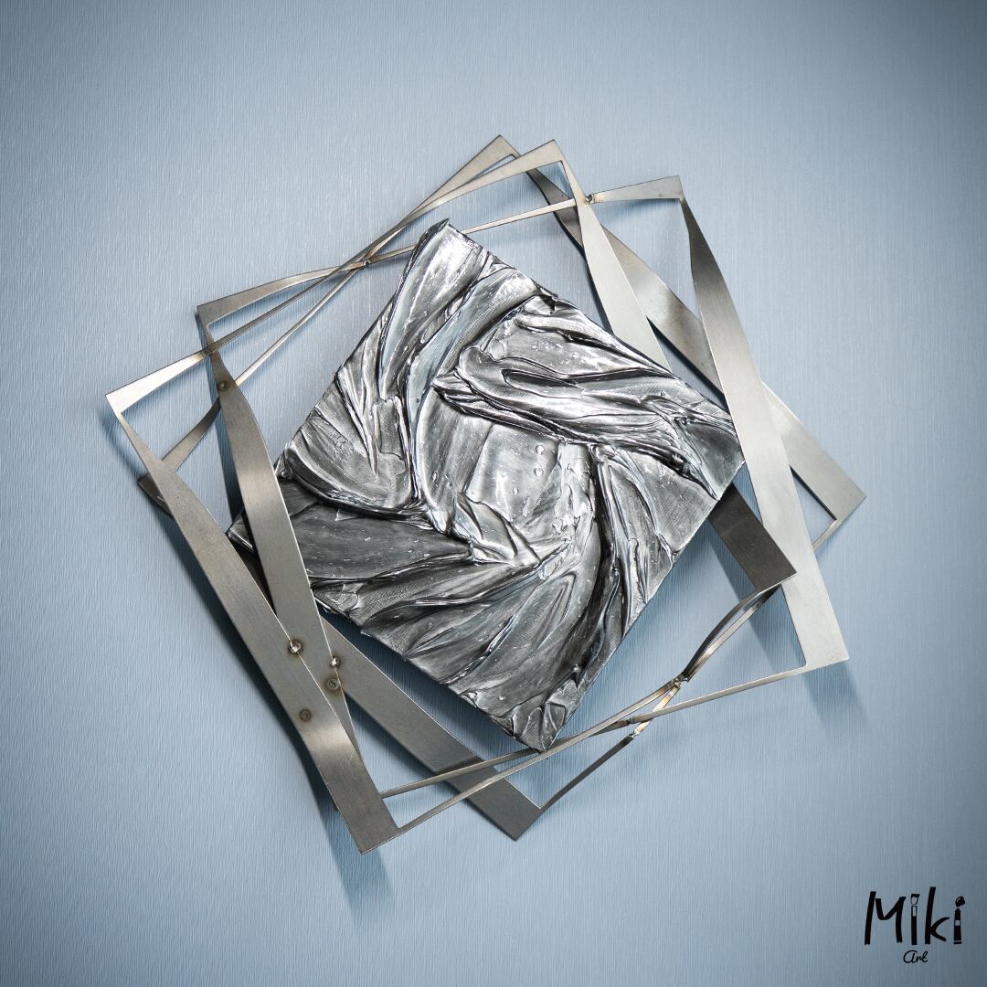 鉄の額縁と金属みたいなアートがクールな作品。