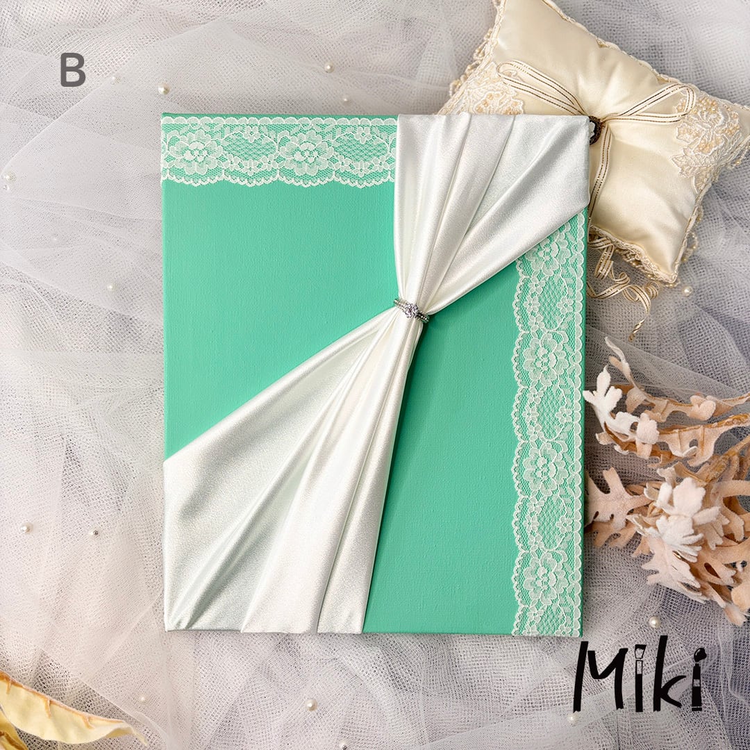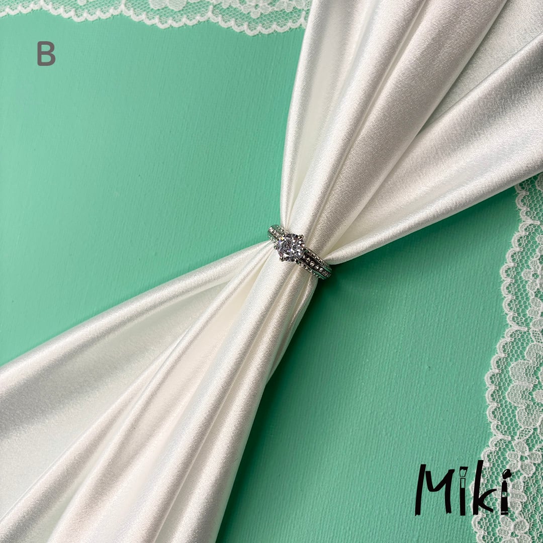 B:レースリボンをベースにサテン生地を重ね、婚約指輪の様なキラキラした指輪で束ねた作品です。